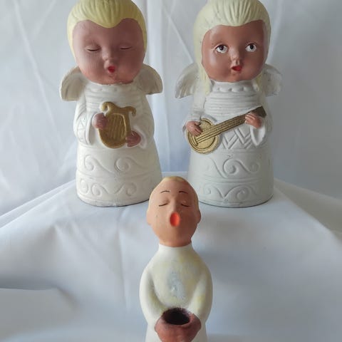 2 retro engle-lysestager af træ. Passer til kertelys eller julelys.