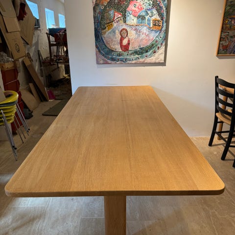 Flot robust egetræsbord i rigtig god stand af Børge Mogensen (BM 202 eller BM 86. De 6 stole også Børge Mogensen er en variant af BM 1 med et læder betrukket sæde). Stolene trænger til nye sæder/polstring, der er huller i læder polstringen, men alt træ på stolene står flot!