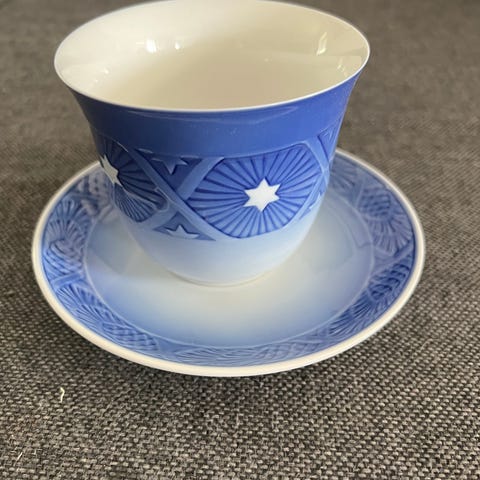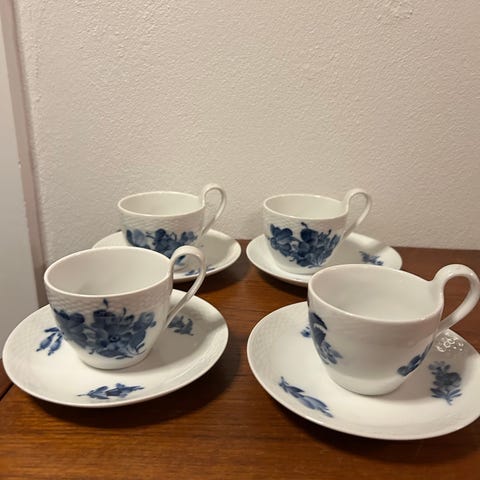 Royal Copenhagen kaffekop og underkop med blå blomsterdekor på hvid porcelæn. Koppen har en kapacitet på 25 cl. Designet af høj kvalitet, egnet til servering af kaffe.