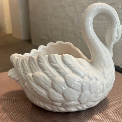 svane skål, f, motiv: svaner, svaneskål med to svaner i farven creme mrk. f