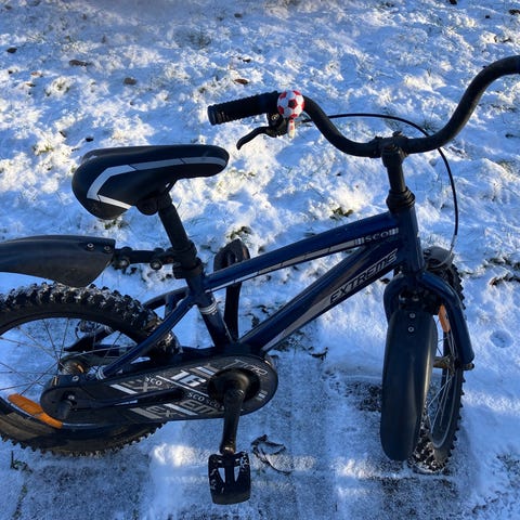 Blå cykel med ringeklokke, støttefod og reflekser for og bag. Den kører rigtig fint og er klar til nye eventyr. Hjulstørrelsen er 16 tommer. Kan bruges fra ca. 3 år til ca. 5 år.