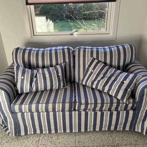 Ektorp sofa Ikea hvid. Betrækket har aldrig været vasket, og det kunne godt trænge til en tur i vaskemaskinen. På venstre side er nogle sorte striber fra noget maling som jeg ikke ved om de kan gå af i vask. Det ene ben er knækket lidt, men det er helt stabilt og har været sådan i tre år. Sofaen er ellers fin i hynder og siddekomfort. Betrækket er ikke slidt. Kun nusset, da det som sagt aldrig har været vasket.