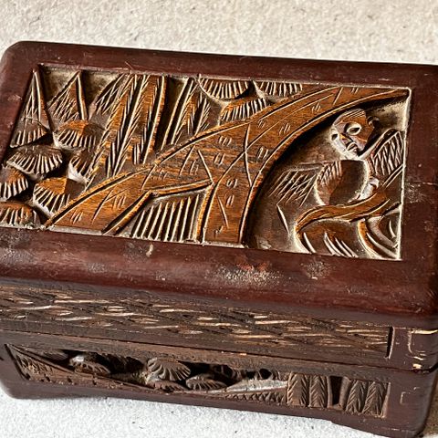 Håndskåret træskrin i kamfertræ fra Asien. Skrinet er dekoreret på alle sider, har en dekoreret lukkemekanisme på forsiden, som kan låses med mindre hængelås.