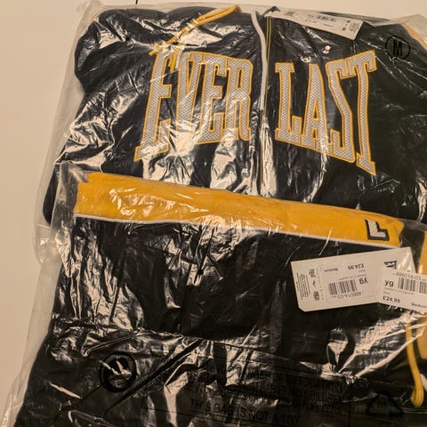 Et helt nyt Everlast træningssæt til mænd i størrelse M, grå farve med gule detaljer.
