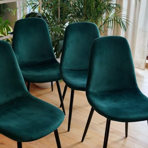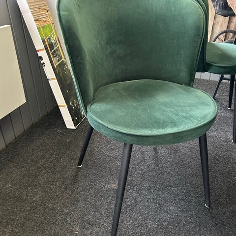 Flotte spisebordstole med grønt velour betræk. Farven er dyb moss grøn, og med sort stel.