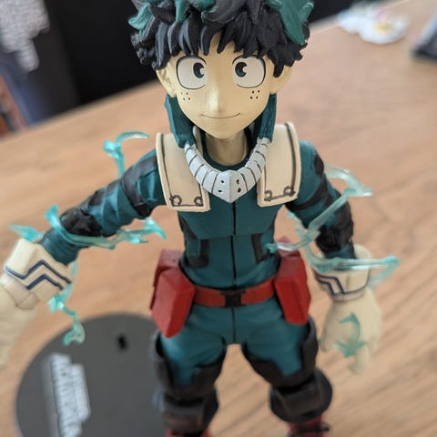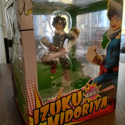 My Hero Academia figurine med detaljeret design, herunder lilla hår med horn, grønne handsker og blå tøj. Figuren er monteret på en gennemsigtig stander og har en størrelse, der passer til samling eller dekoration.