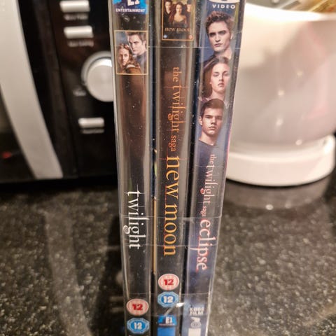 Twilight Saga DVD med filmcover, indeholder flere film i serien. DVD'en er i standard størrelse og designet til filmvisning.
