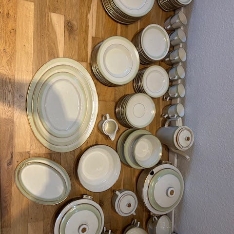 Kaffekande og sukkerskål af stellet Broager, Kgl. Procelæn sælges. Enkelt og smukt design af Thorkild Olsen fra 1933. Porcelænet er i en knækket hvid med lys mosgrøn kant og tynd guldkant yderst.