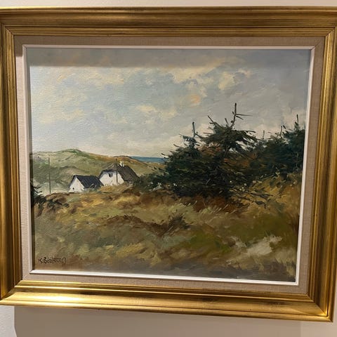 Maleriet er et landskabsmaleri udført i olie, som forestiller et kystlandskab, muligvis dansk, med et hvidt hus og fyrretræer.