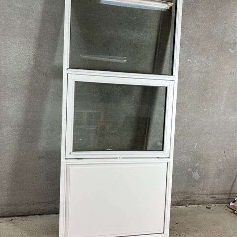 Udestueelement i plast, udført i Rehau profiler med 3-lags energi rude og friskluftventil. 1 fyldning - 2 ruder, oplukkes i midten. Har været monteret kortvarigt. Fugerester forekommer. Har en skade på udvendig side.