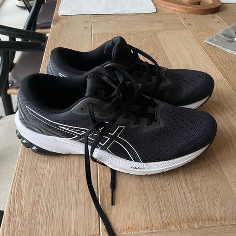 Asics GT-1000 7 løbesko i størrelse 37. Skoene har en kombination af mørk lilla og pink farver med hvide detaljer. Designet til løb med fokus på komfort og støtte.