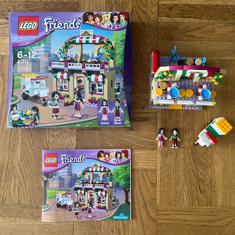 LEGO Friends 41311 Pizza Delivery Café legetøj med 289 dele. Sættet indeholder en cafébygning med to etager, udendørs siddeplads og en pizzaudbringningsbil. Inkluderer figurer til leg og samling.