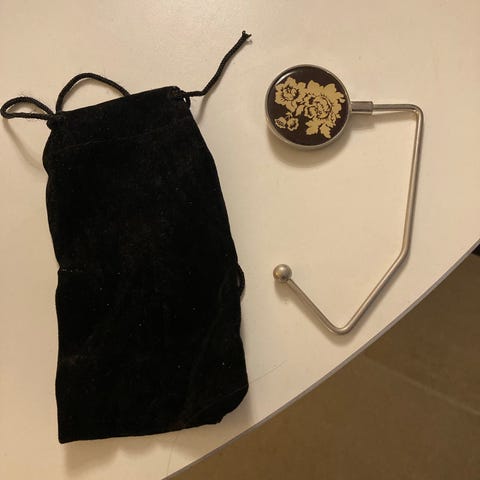 Bag holder, to be put on the table edge, hang your bag or carrying bag etc. on the hook and let go of dirty floors. Inclusive gift box and velour bag. Ideal girlfriend gift.