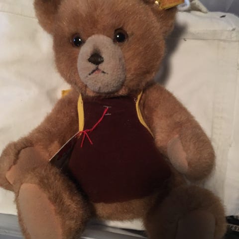 Steiff Original 8720/70 trold bamse iført ternet skjorte, vest, jakke og bukser. Bamsen har pelsdetaljer og er fremstillet med stof og bløde materialer. Originalt mærke fra Steiff er synligt på tøjet.