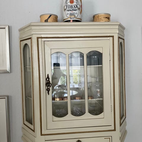 Vægskab i træ med en glasdør og to hylder indvendigt. Skabet har en rektangulær form og er velegnet til opbevaring af mindre genstande eller dekorationer. Designet er enkelt og funktionelt.