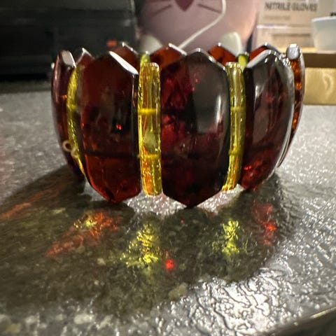 Deres armbånd er designet med forskellige udtryk, fra klassisk cognacfarvet rav til stykker med synlige indeslutninger som plantedele eller insekter."