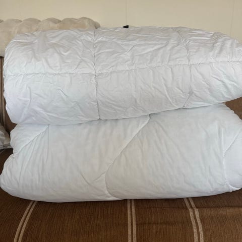 , 2 stk. dyne elegant , bløde og holdbare Hej den blå farver dyne er 135x190 cm. , og ande dun , den hvid farver dyner er 135x 225 cm. Ande dun , vh, pris stk.