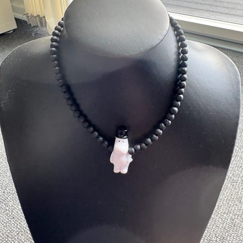 Måler ca 40 cm, den hvide halskæde er lidt længere