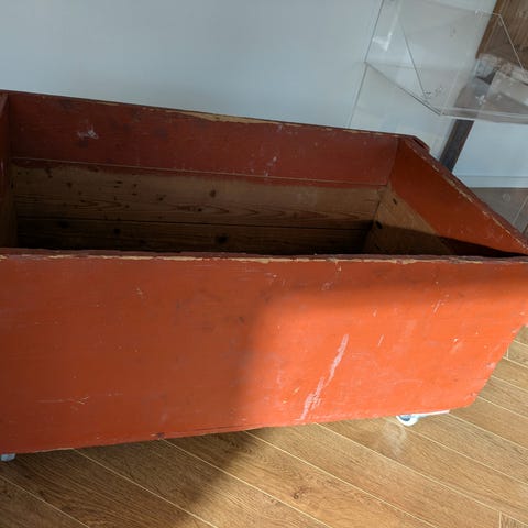 Gl sættekasse. Kan bruges til at organisere de små stykker legetøj feks Lego figurer. Hæng den evt op i børnehøjde.