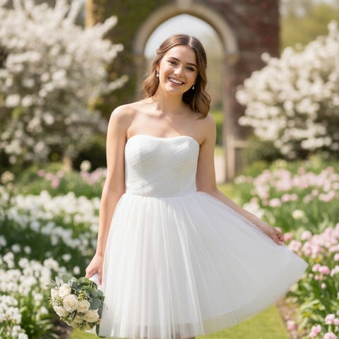 (Udstillings model) Knækort kjole! Det smukt strukturerede, stropløse satintop er skabt med elegante vandrette og diagonale plisseringer, der fremhæver taljen. Nederdelen består af flere lag blødt, fyldigt tyl, der sikrer et let og eventyrligt fald. Ideel til konfirmanden, brudepigen eller enhver lejlighed, der kræver et touch af romantisk elegance.