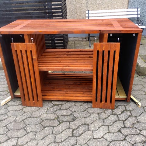 Luksus grillbord fra Kabeltromlen med gasflaskeskjuler fremstillet i træ. Grillbordet måler 100 cm i længden og 52 cm i bredden og har et robust design med hylder til opbevaring og en integreret skjuler til gasflasker. Bordpladen viser tegn på brug med pletter. Velegnet til udendørs brug som støtte til grill og opbevaring af tilbehør.