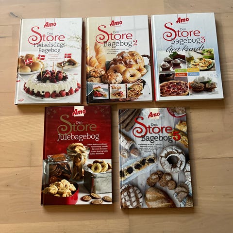 Amo Storebagebog 2 og 3 kogebøger med opskrifter til bagning og madlavning. Indeholder forskellige bageopskrifter, illustreret med billeder. Bøgerne er på dansk og egner sig til brug i køkkenet til forberedelse af bagværk.