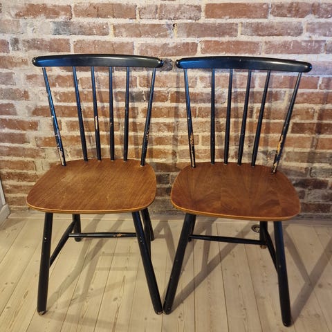 2 retro Farstrup pindestole med synlige brugsspor. Der er gnavet i stolenes tværpinde mellem stoleben af en dum hund. Trænger til lidt kærlighed.