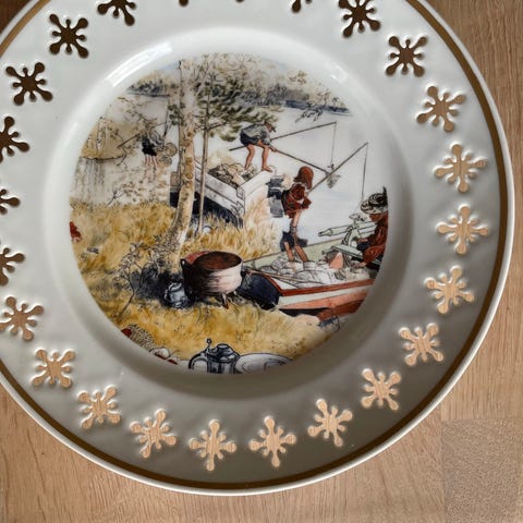 Bing & Grøndahl Fiskeri dekorationsplade med motiv af en fisker. Pladen har en diameter på ca. 19 cm og er dekoreret med guldornamenter langs kanten. Serienummer 8732, udgivet som en limited edition i 1978 baseret på et maleri fra 1905 af Carl Larsson.