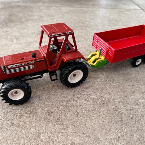 Simba trælegetøj bestående af en traktor og en tilhørende trævogn. Traktoren har røde hjul og detaljer, og vognen har blå-hvide hjul med en rød snor til at trække den. Legetøjet er fremstillet i træ og har flere huller i vognens bund, hvilket kan give ekstra funktionalitet i leg.