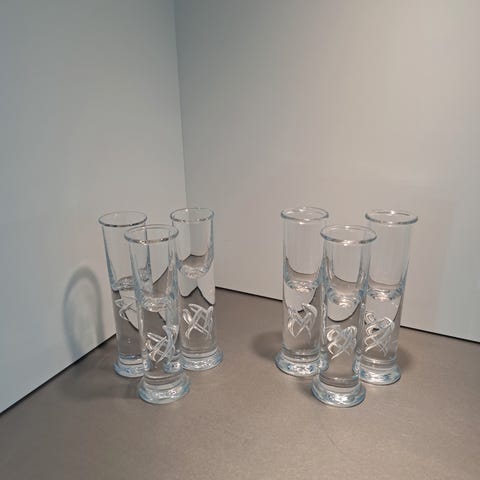 Fire fine snapseglas i serien High Life designet af Per Lütken for Holmegaard Glasværk. Glassene er 2. sortering (variation i kummestørrelse og spiral - små glasbobler) med kun få og små brugsspor.