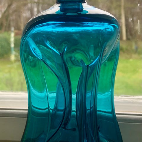 En smuk blå glas karaffel / klukflaske fra Holmegaard — et stykke klassisk dansk glaskunst, der både er dekorativ og funktionel.