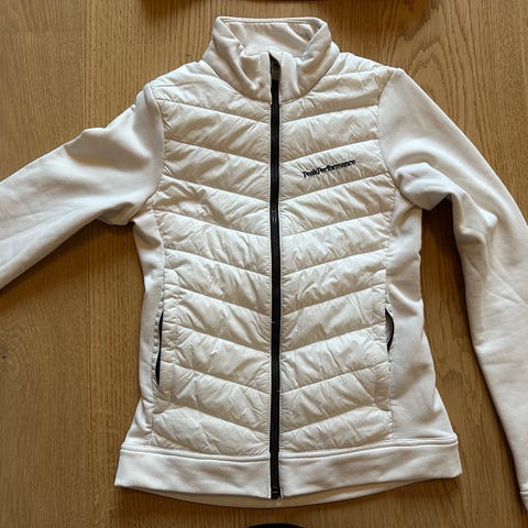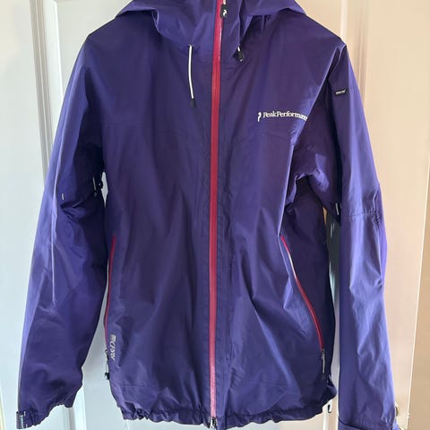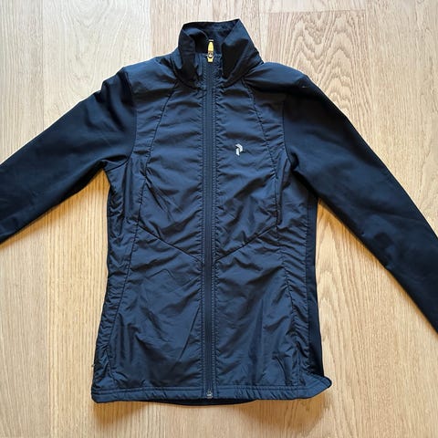 Peak Performance damejakke i størrelse M. Jakken er mørk blå med hvide detaljer og designet til sport og fritid. Materialet er robust og velegnet til forskellige vejrforhold.