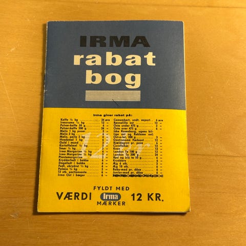 Irma Rabat Checks rabatkuponer med forskellige værdier i kroner. Kuponerne er designet til brug i Irma butikker og indeholder instruktioner og vilkår for brug. Farven er primært blå og hvid, og kuponerne er trykt på papir.