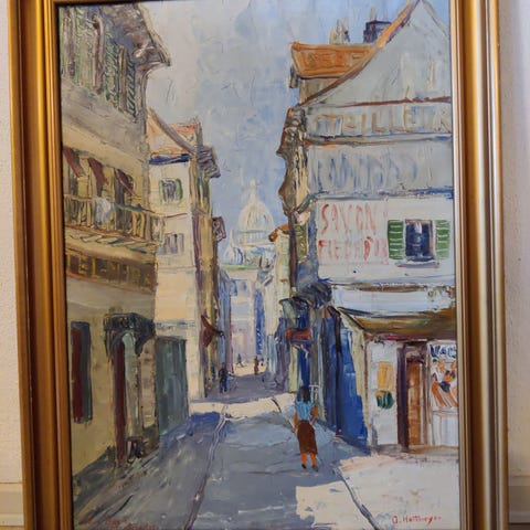 Maleri byscene Paris med ramme. Købt i Montmartre i Paris i 1988.