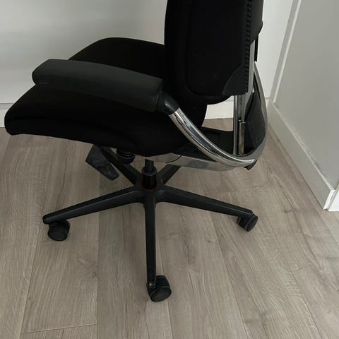 Den er blevet brugt i ca. 2 år. Kan lænes tilbage i ryggen. Hjul på. Armlænene kan tages op og ned. Højden kan justeres