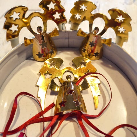 Georg Jensens klassiske juleengle, 3 flotte engle fra Georg Jensen med originalt rødt bånd. Guldbelagte i fin æske. Brugt en gang.