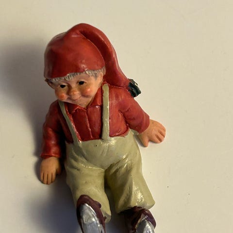 Julepynt, der forestiller et hus med sne på taget og en nisse figur. Dekorationen er designet til brug i julesæsonen og kan anvendes som en del af juleudsmykningen. Man kan sætte et fyrfadslys indeni.