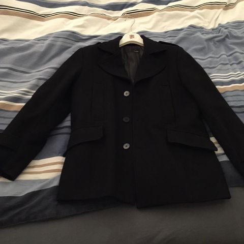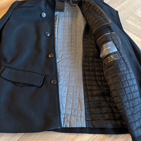 Bertoni White frakke i militær grøn farve, lavet af uldmateriale. Størrelse M, designet til mænd. Frakken har hætte, lynlås og knaplukning i brun.