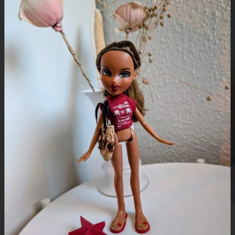 Vintage Flaunt it Yasmin dukke med original tilhørende jeans. Det andet tøj og tasken tilhører ikke hende oprindeligt, men stammer bla. Fra Boutique fashion serien og Bratz beach party. God brugt stand - lidt pletter på ben (se billeder).