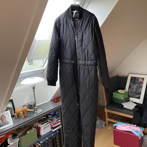 Svagt lysegrøn - hætten kan lynes af. Livvidde højst 108 cm. og indvendig benlængde 75 cm. Ikke brugt meget – men obs. 8. foto. (øverst indvendigt på låret) Afhentes eller kan sendes med dao for 45 kr. uden omdeling.