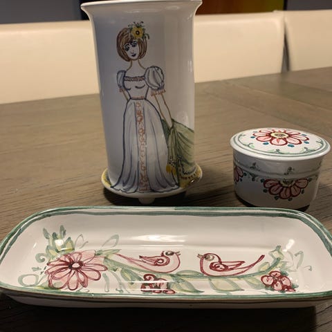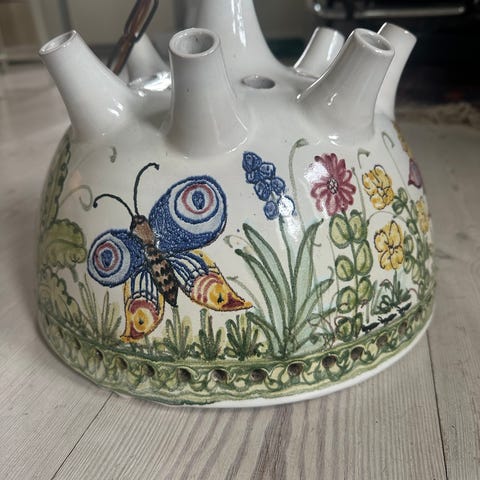 Meget stor krukke eller urtepotte af Nøfle Lustü, der dekorerede keramik for Bjørn Wiinblad i mere end 35 år. Højde 28cm, dybde 32,5cm. Den har 2 mindre lapninger i glasuren i bunden, som ikke ses, når den står. Ingen brugsspor indeni.