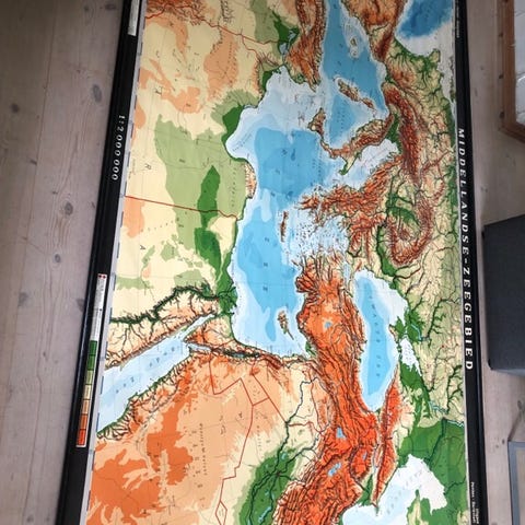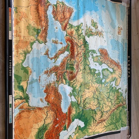 Europakort som vi kender det fra skolen med målestok 1:3.000.000. Kortet er monteret med en læderrem til ophæng. Farverne viser terræn og geografiske detaljer. Kortet kan bruges til undervisning, dekoration eller geografisk reference. Nordisk Korthandel 2000. Bredde: 215 cm. Jeg har desværre ikke plads til at rulle det helt ud. Kom gerne og se det. Masser af patina men ikke større skader.