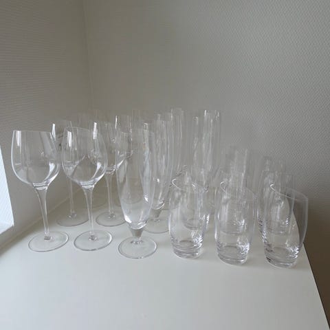 Eva Solo glas sæt bestående af flere typer glas, herunder vinglas (6 stk. Bourgogne og 3 stk hvidvin) samt 6 små vandglas.