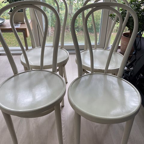 Gammel wienerstol med træsæde og støtter/forstærkning i siden, stolen er fra Jacob & Josef Kohn, Wien. Denne stol er +/- 100 år gammel, stolen er/vil blive istandsat. Stolen måler 43,5×47,5 cm siddehøjde 46,5 cm ryghøjde 90 cm, sædet har en diameter på ø41 cm. Wienerstolen er istandsat og i god stand.