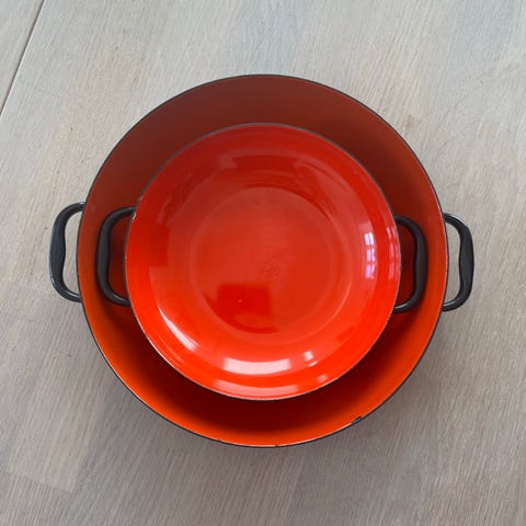 Begge med rød emalje i bunden og hvid emalje indeni
