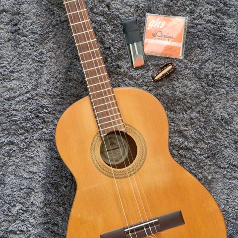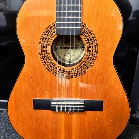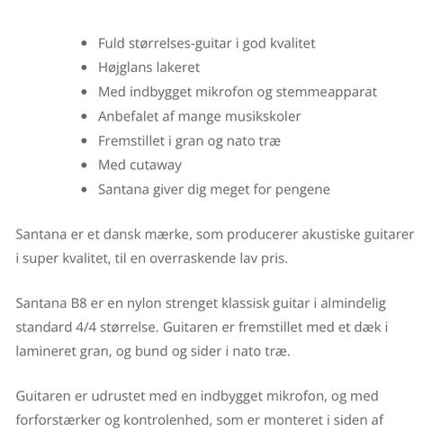 Santana CG-30 akustisk guitar med traditionelt design. Guitaren har en træfinish med detaljeret ornamentering omkring lydhullet. Den er udstyret med seks strenge og stemmeskruer i klassisk stil. Leveres med blødt taske til opbevaring og transport.