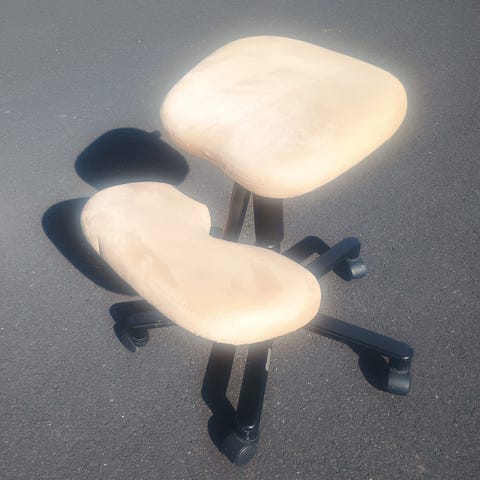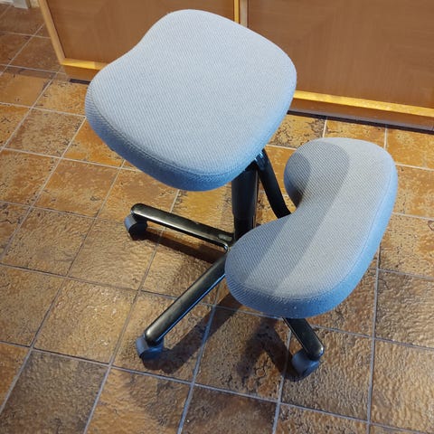 HÅG Balans Vital kontorstol med blå betræk i stof. Stolen har en unik ergonomisk design med knæstøtte og hjul, der giver mulighed for aktiv siddestilling. Fremstillet i Norge med patenteret design.