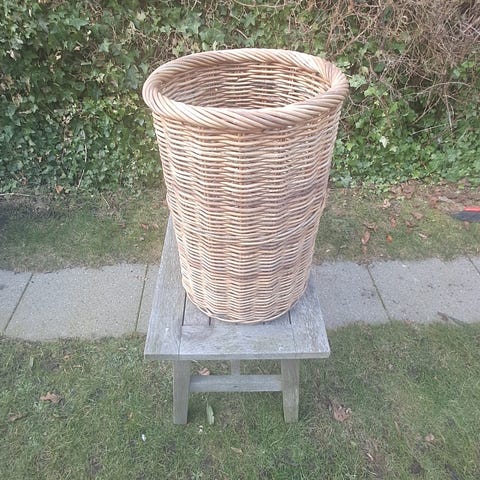 Rustik fletkurv i naturligt materiale med tilhørende galvaniseret metalspand. Kurven har en rund form og passer til opbevaring eller dekoration. Metalspanden har to små håndtag og et håndtag med trægreb for nem transport. Kurvens og spandens dimensioner fremgår af billederne.