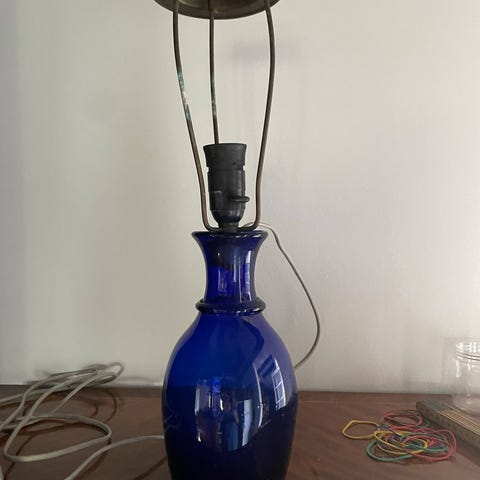 Lampe Røgfarvet glasvase med en guldfarvet bund. Lampen har et ribbet mønster og en rund form, hvilket gør den egnet til dekoration.