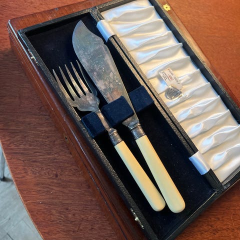 Fiskebestik 12 knive og 12 gafler med cremefarvede håndtag